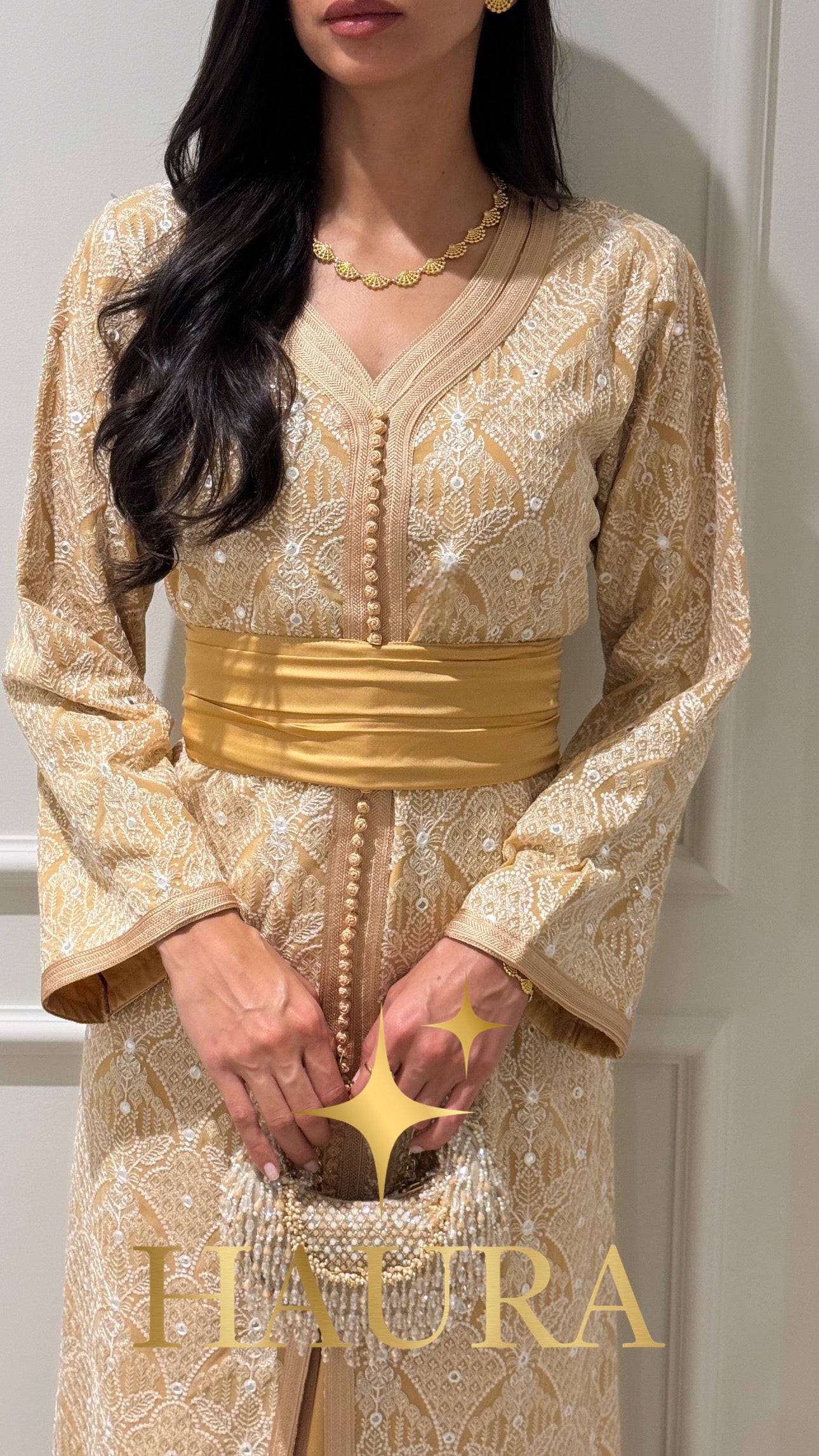 قفطان ملكي بتفاصيل مغربيه اصيله وقماش هندي حصري من توقيع Haura، وتصميم يعكس الفخامة الشرقية بلمسة عصرية.